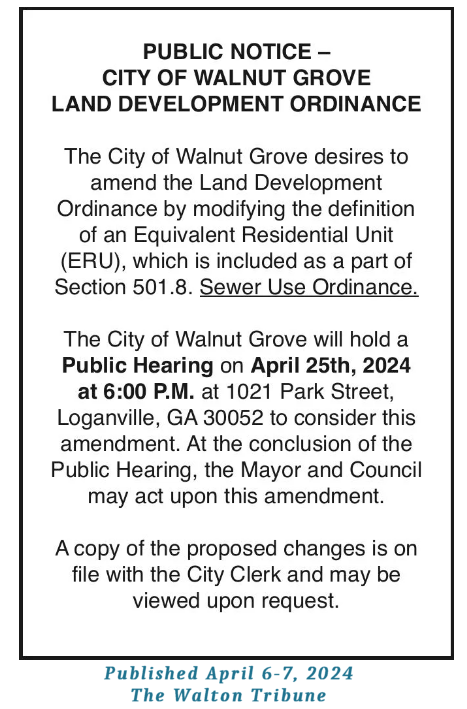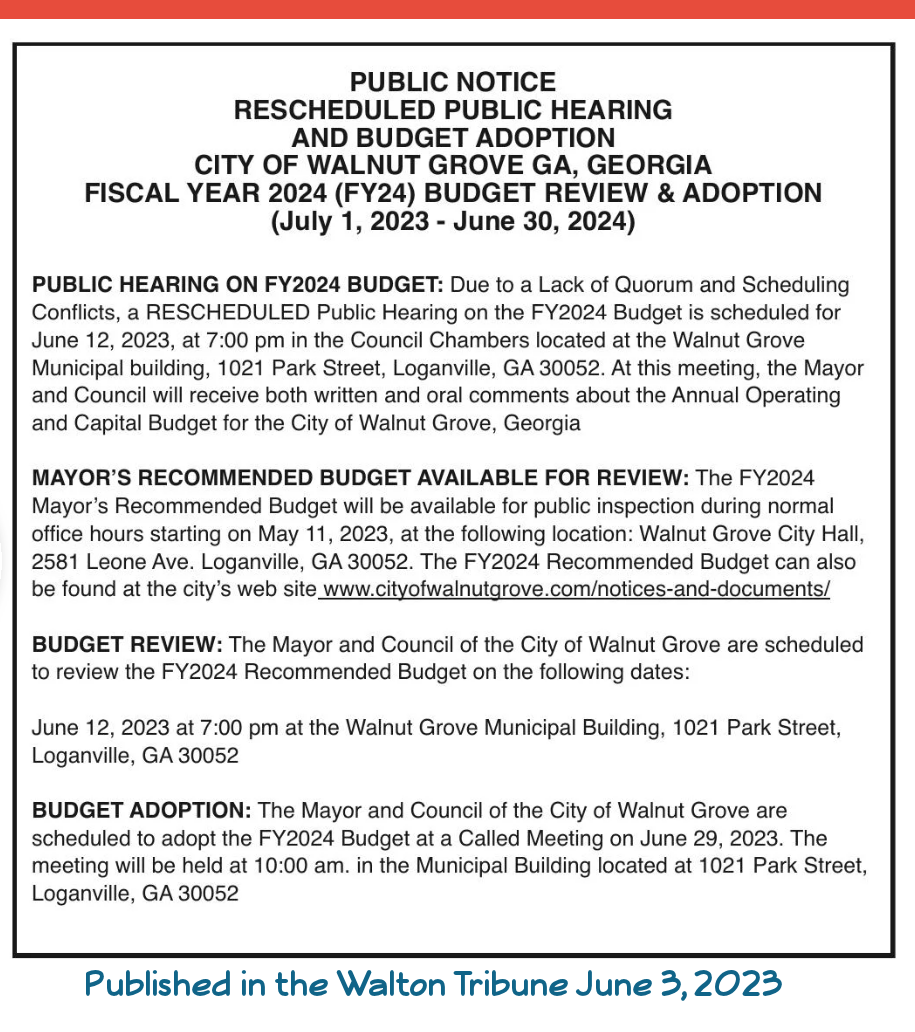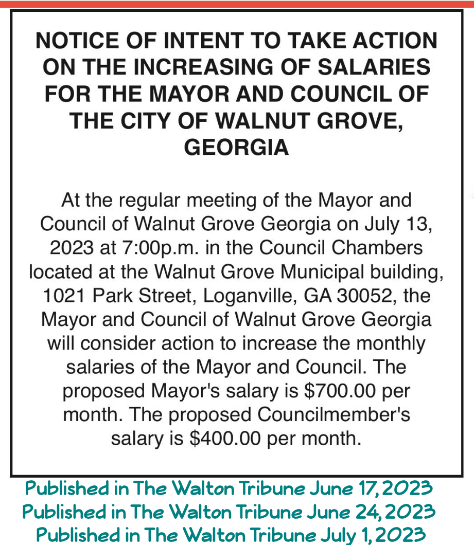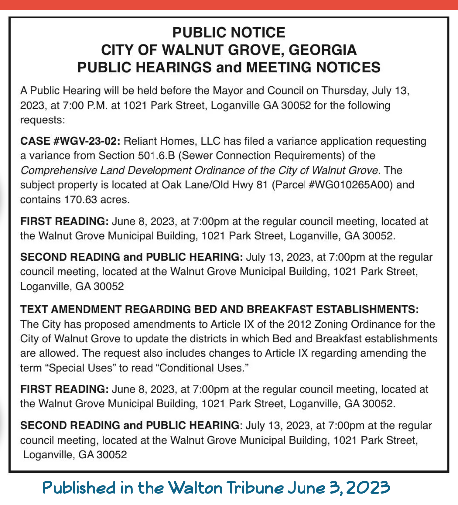 - Notice in Walton Tribune June 3, 2023 for Jun 12 and Jun 29 for a Vote by council